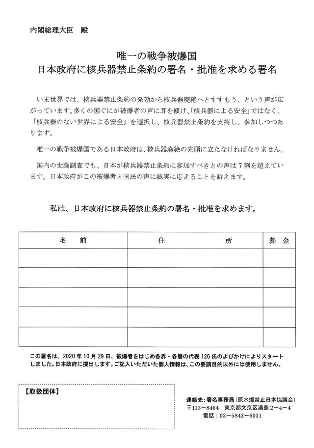 新署名は、日本政府に核兵器禁止条約の署名・批准を求める一点での合意形成をめざし、日本政府に提出します。(署名用紙別掲)