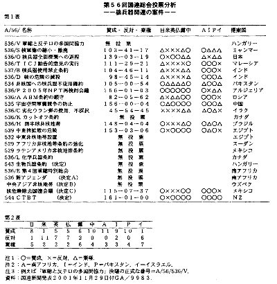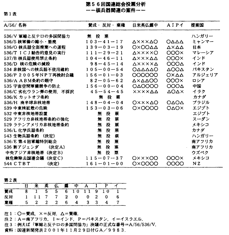 アメリカの単独行動主義の動きが核の分野をふくめ強まるなかで、また2000年総会で確認された核兵器国による自国核軍備の全面廃棄の「明確な約束」になんら進展がみられない状況のもと、核兵器関連の諸決議が討議され、採択されていることに留意したい。(投票結果は第1表,第2表を参照).