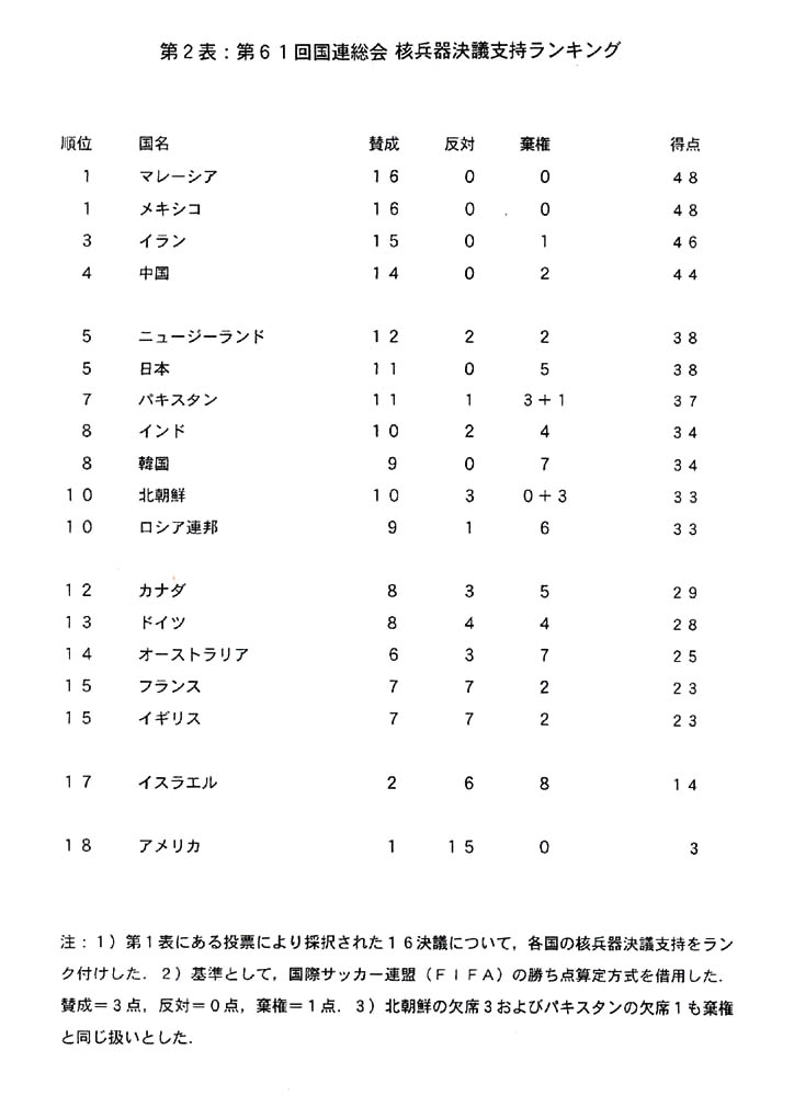 第1表の多数決で採択された案件の投票結果について、各国の核兵器廃絶志向を“数値化”したのが第2表である。国際サッカー連盟(FIFA)の勝ち点方式により、賛成=3、反対=0、棄権=1として得点を計算した。