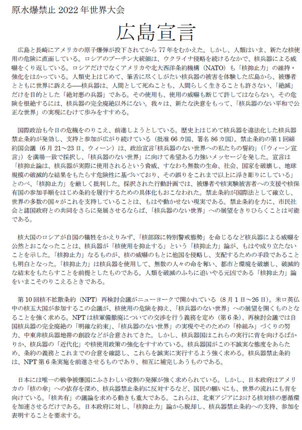 原水爆禁止2022年世界大会 広島宣言