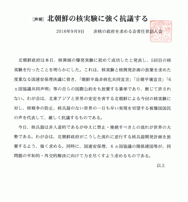 非核の政府を求める会は9月9日、北朝鮮の5回目の核実験強行に対し、次の抗議声明を発表、同国政府宛て送付しました。