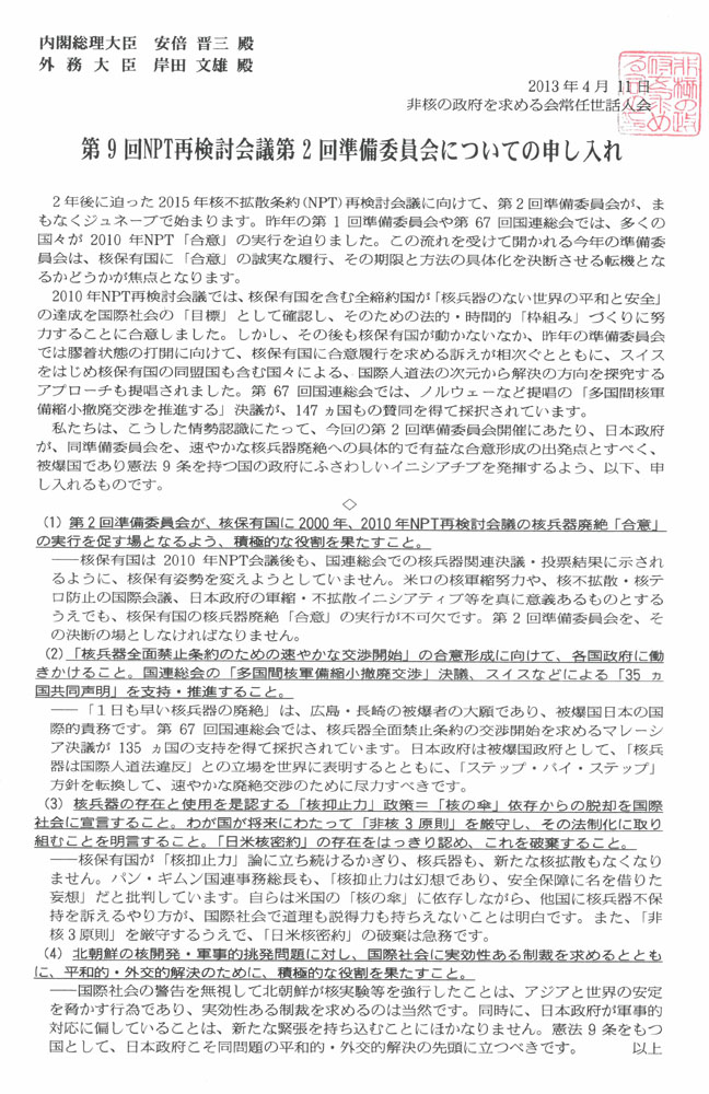 要請の内容は、@第2回準備委員会が核保有国にNPT再検討会議の核兵器廃絶「合意」実行を促す場となるよう、積極的な役割を果たすこと、A「核兵器全面禁止条約の速やかな交渉開始」の合意形成に向けて国連、各国政府に働きかけること、B「核抑止力」=「核の傘」依存からの脱却を宣言すること。「非核3原則」の厳守・法制化を明言すること。「日米核密約」を破棄すること、C北朝鮮の核開発・軍事挑発に対し、国際社会に実効性ある制裁を求めるとともに、平和的・外交的解決のために憲法9条を生かし積極的役割を果たすこと――の4項目。