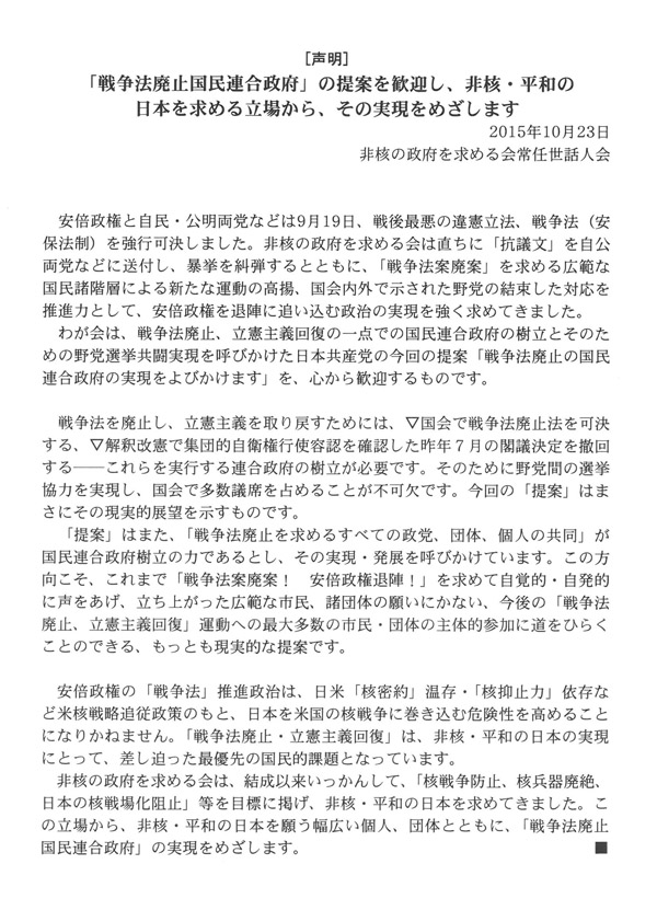 「戦争法廃止国民連合政府」提唱について歓迎声明を発表