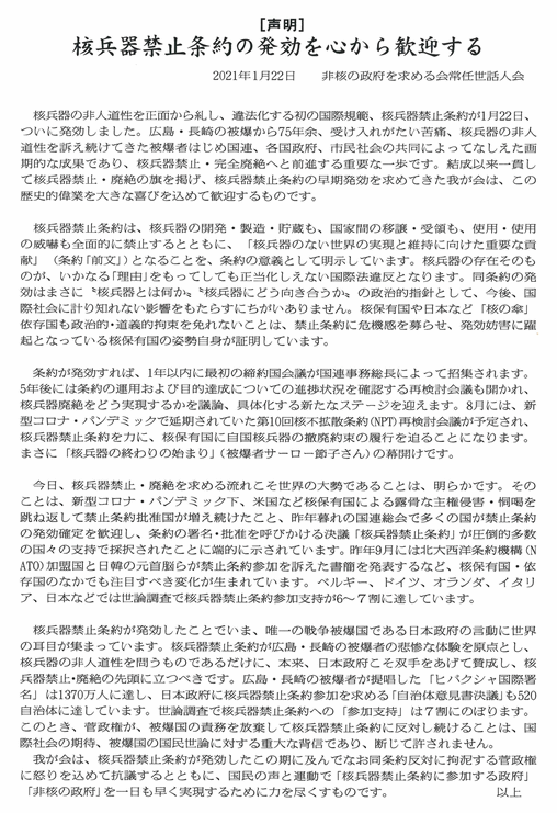非核の政府を求める会は1月22日、次の声明「核兵器禁止条約の発効を心から歓迎する」を発表し、日本政府と各党、および各国の駐日大使館宛て(英文)送付しました。