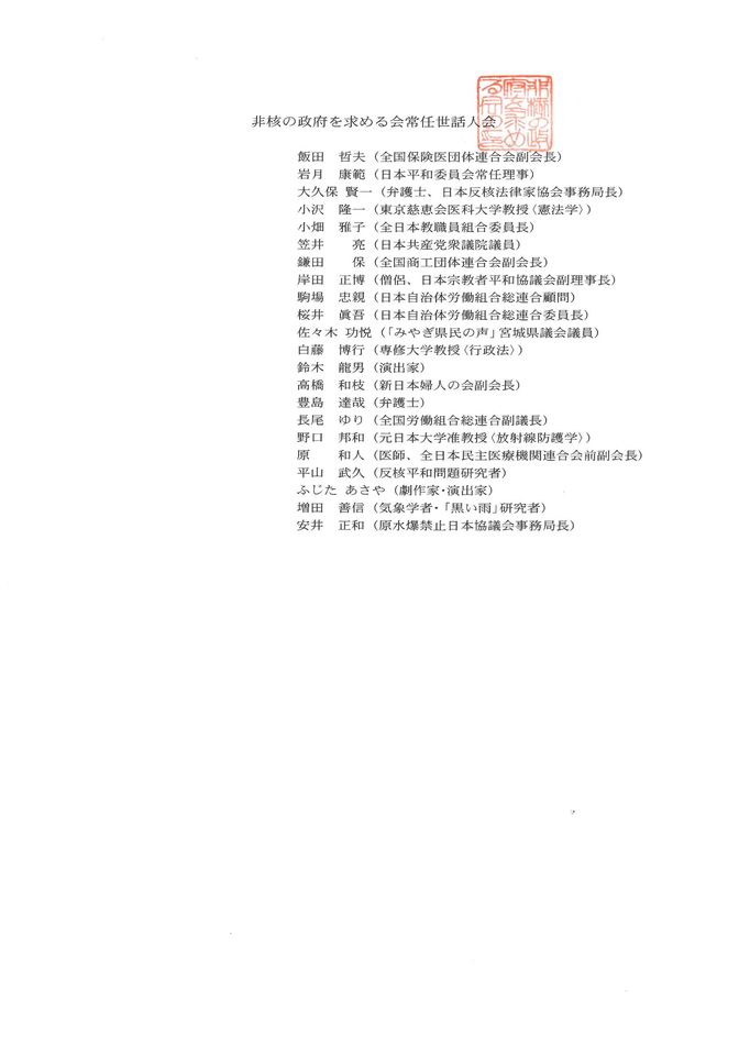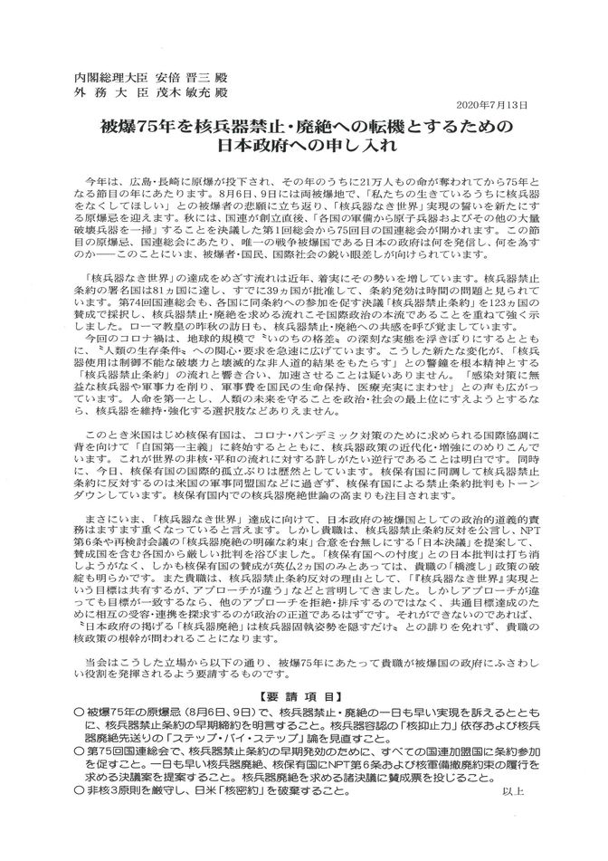 要請の内容は、日本政府が、▽被爆75年の「原爆の日」(8月6日、9日)で、核兵器禁止・廃絶の一日も早い実現を訴えるとともに、核兵器禁止条約の早期締約を明言すること。核兵器容認の「核抑止力」依存、核兵器廃絶先送りの「ステップ・バイ・ステップ」論を見直すこと▽第75回国連総会で、核兵器禁止条約の早期発効のために、全国連加盟国に条約参加を促すこと。一日も早い核兵器廃絶、核保有国にNPT第6条および核軍備撤廃約束の履行を求める決議案を提案すること。核兵器廃絶を求める諸決議に賛成すること▽非核3原則を厳守し、日米「核密約」を破棄すること―の3項目。(2面に要請文全文)